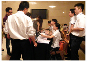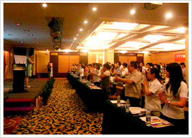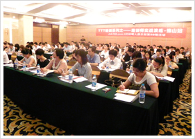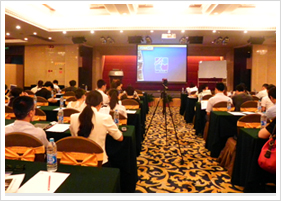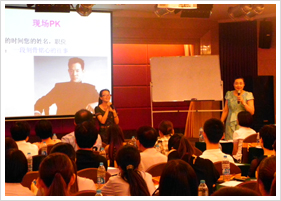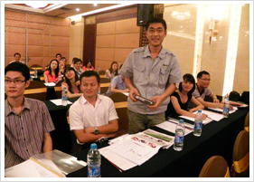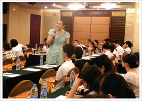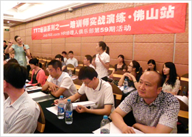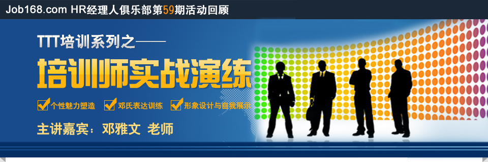 7月13日下午,第59期Job168.com HR经理人俱乐部活动在佛山金城大酒店三楼宴会厅成功落下帷幕。本次活动邀请了东芝家电(南海)有限公司、李宁(中国)体育用品有限公司、佛山万科、罗浮宫家具博览中心、新中源陶瓷等近150家企业的HR精英代表参与了此次活动。国家注册高级企业培训师邓雅文老师为本次活动的特邀嘉宾主持。下午2点05分, “培训师实战演练课”准时开始,邓老师从“培训师应具备的能力”讲起,一名优秀的培训师应具备的能力包括沟通力、影响力、表达力、应变力、观察力、学习力等九大能力。接着带领大家现场模拟了目光训练,表达力训练... 培训师的眼神在培训中起的作用有时比语言与动作更为重要,经常进行眼神训练,可训练出一双炯炯有神的眼睛,为培训课程增色。就如何提高表达力?邓老师强调:文字语言占表达效果的7%,有声语言占38%,肢体动作占55%。课堂中,邓老师多次带领大家进行语音语调的练习及集体朗诵诗歌,将本次活动推向了一个新的高潮。